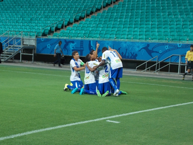 Jogadores comemoram um gols dos na partida. Foto: Hilton Oliveira.