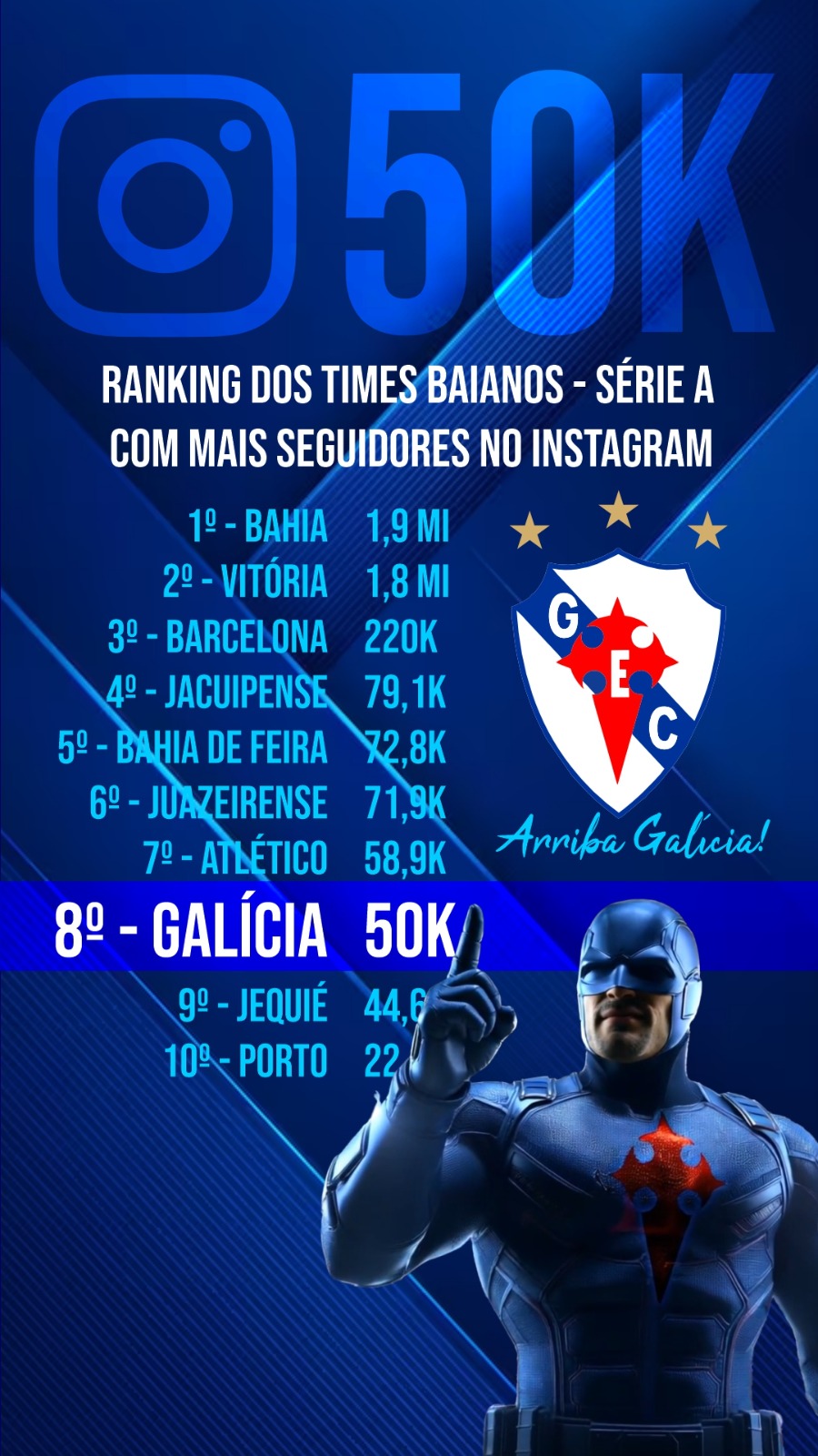 Com os 50k, o Instagram do Galícia se consolida na 8ª posição entre os clubes baianos.